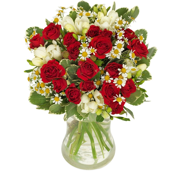 Festlig buket med røde og hvide blomster i en smuk harmoni. Perfekt til konfirmation, studenterfest og alt andet, du vil fejre. Buketten er et eksklusivt floristhåndværk, hvor blomsterne er nøje udvalgt for at sikre høj kvalitet. Hver buket er unik og bindes ud fra sortiment og sæson – men bevarer altid sin farve og form. Buketten leveres af en lokal florist.